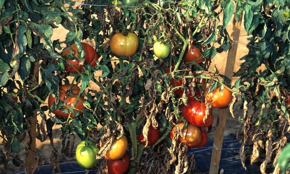 Самая распространенная болезнь у томатов – фитофтороз картофеля. Грибоподобный организм (Phytophthora infestans) зимует на клубнях картофеля и растительных остатках. Зараженный картофель заражает помидоры. Симптомы часто видны уже в апреле (под укрытием) и в июне (в полевых условиях). Сильные заражения возникают при температуре ниже 15 ° C. Дожди дополнительно способствуют развитию возбудителя.