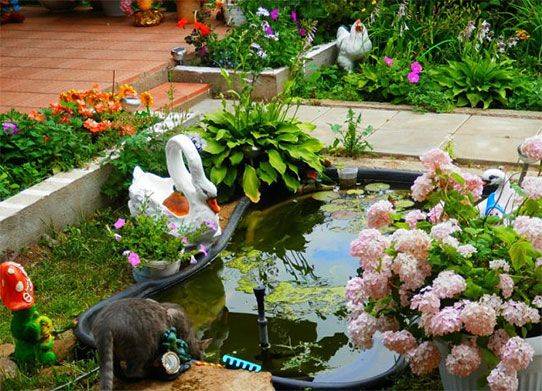 Самый любимый уголок у хозяйки в саду - у водоема. Именно с него появилась идея создать под открытым небом своеобразную комнату отдыха. Вкопали за домом пластиковую форму, заполнили водой, высадили вокруг растения, насобирали камней, выложили галькой дорожки. Сегодня у водоема уютно расположились забавные фигурки: аист, крокодил, гномики, лягушки, уточка. В будущем появятся и новые садовые фигурки, и фонари.