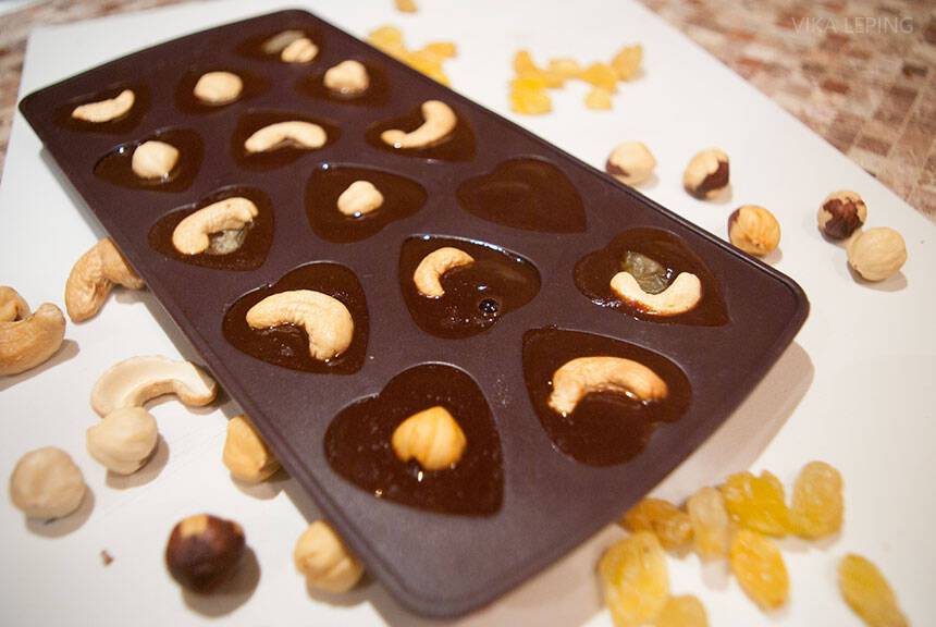 Заливаем формочки наполовину шоколадной массой, а вторую половину формы заполняем измельченными орехами. Вместо орехов можно взять другие сладости, например, зефир, джем, желе, различные помадки.